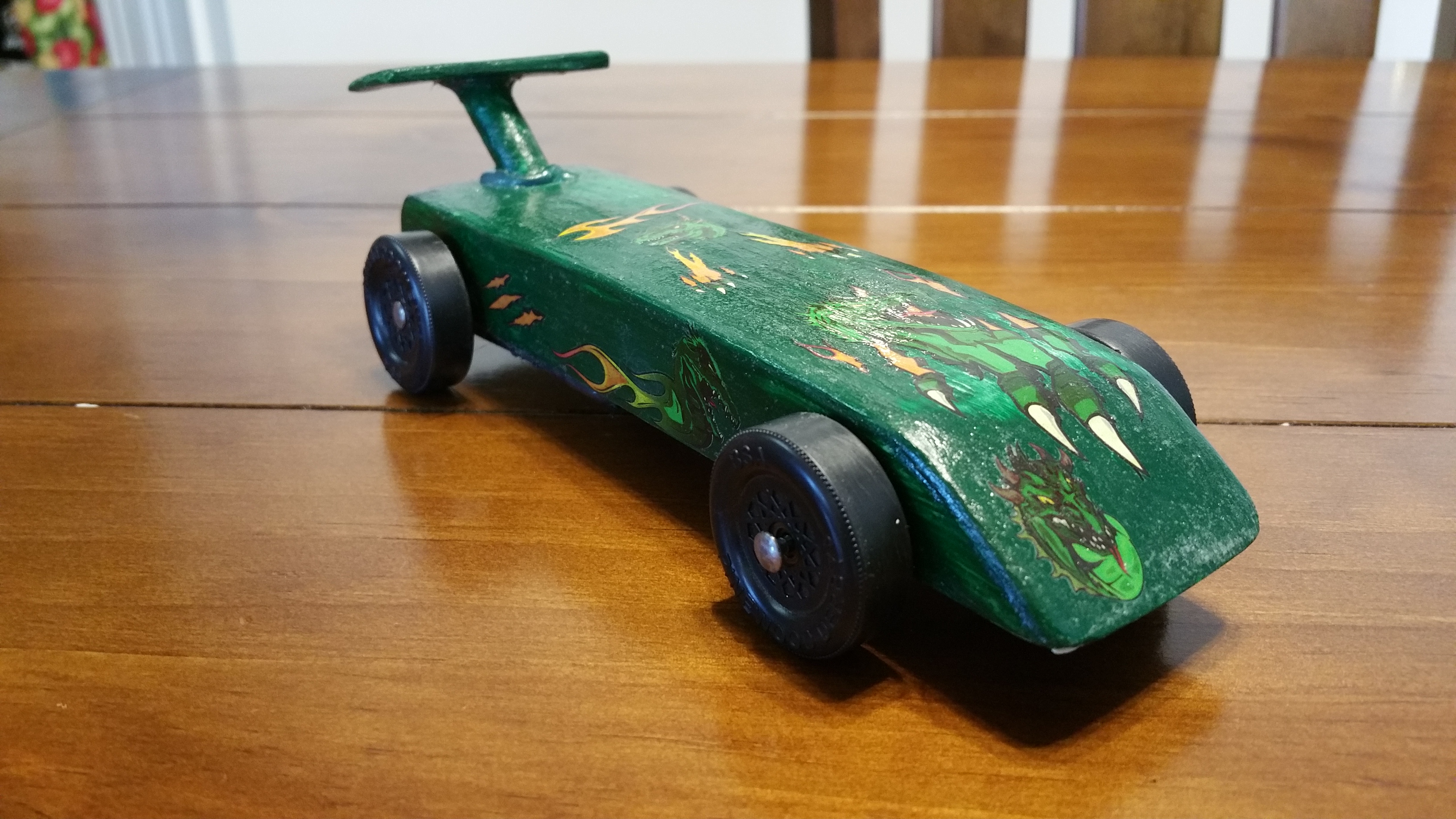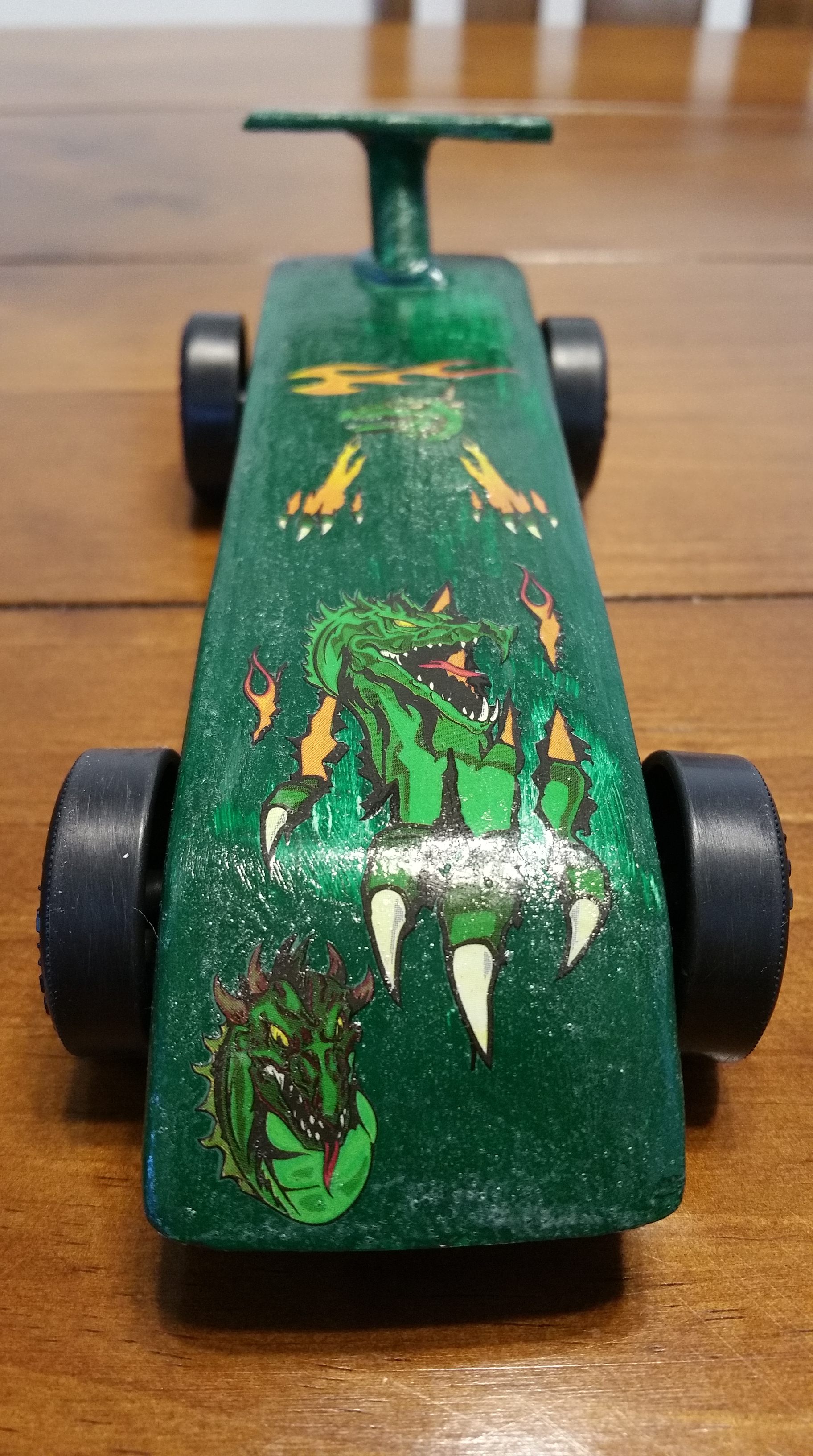 This is the Pinewood Derby car that JD built for his Cub Scouts Pinewood Derby Race. This car is called the Dragon Burner! It never lost a single race, and it raced six times!