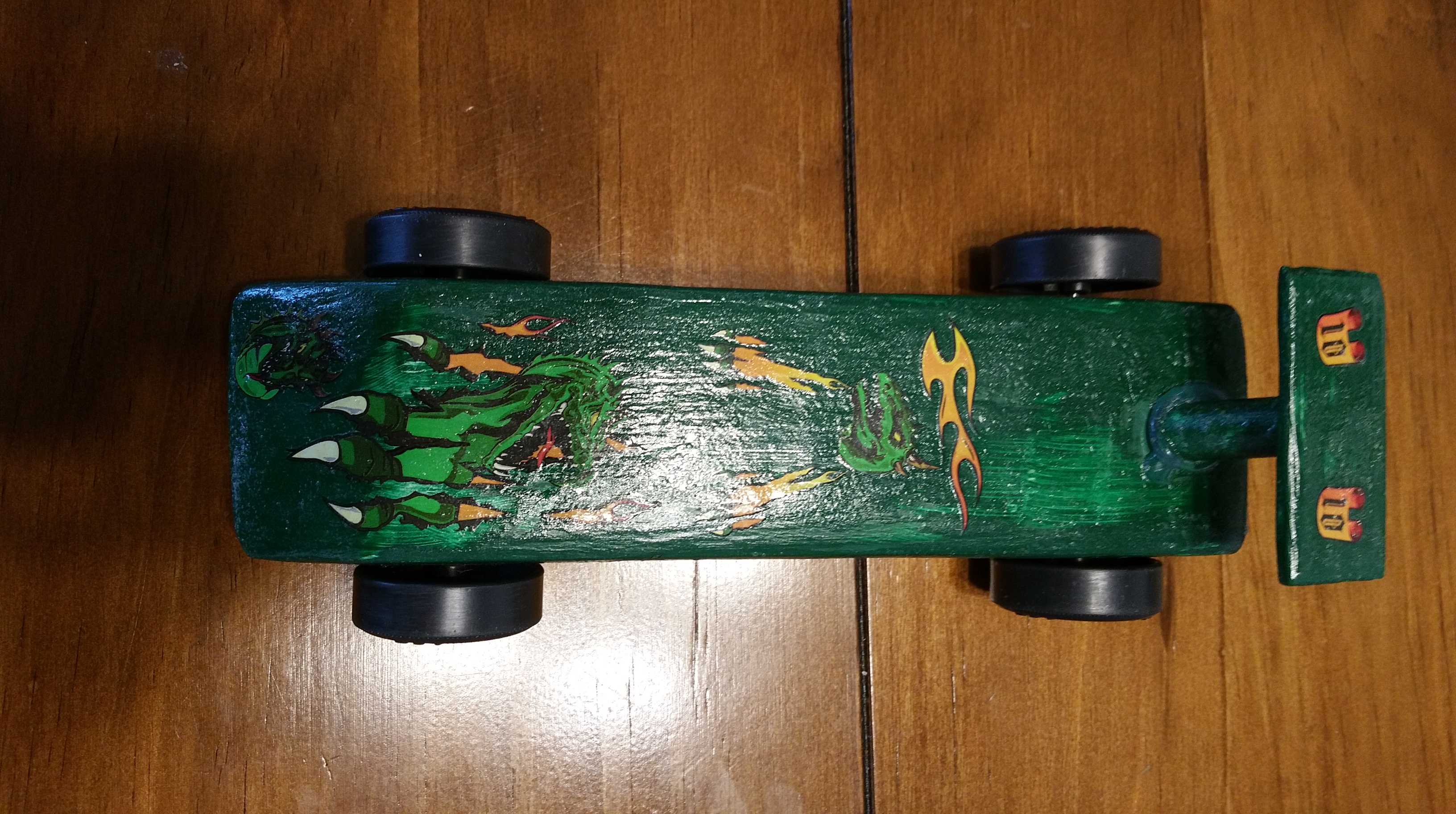 JD put a lot of work into this car. He did sanding with an electric sander, he polished the axles, he put graphite on the axles, he painted the car, he sealed the car, and just so you know, he actually is the one that came up with this awesome design concept for the car. The way that it is shaped, yeah, that was his idea.